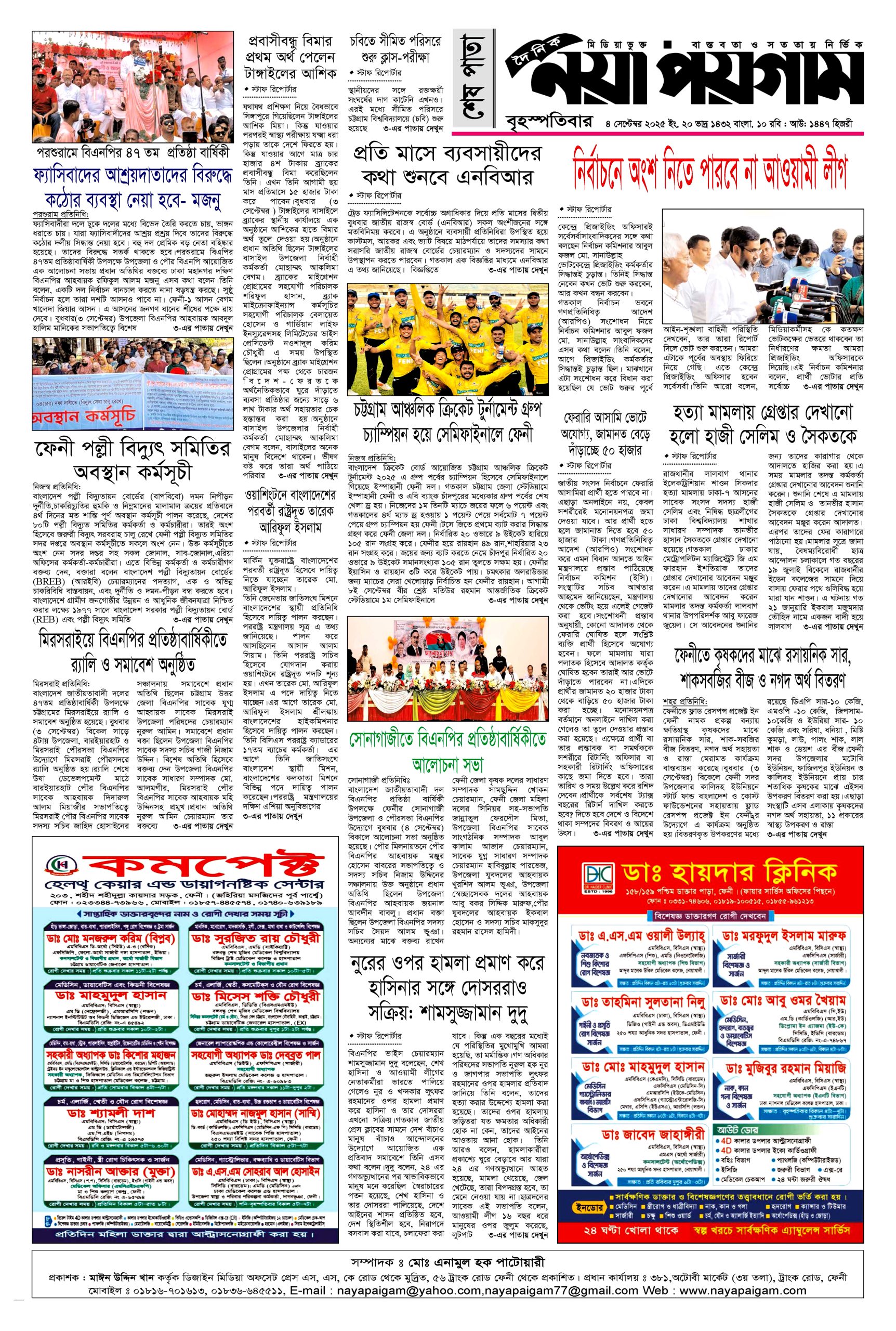 সম্পাদক: মোঃ এনামুল হক পাটোয়ারী, অফিস: ৩৮১, অটোবি মার্কেট,(৩য় তলা) ট্রাংক রোড,ফেনী।, 3900 ফেনী বাংলাদেশ। মোবাইল নাম্বার: +8801816-701613, +8801836645511, ইমেইল: nayapaigam@yahoo.com nayapaigam77@gmail.com